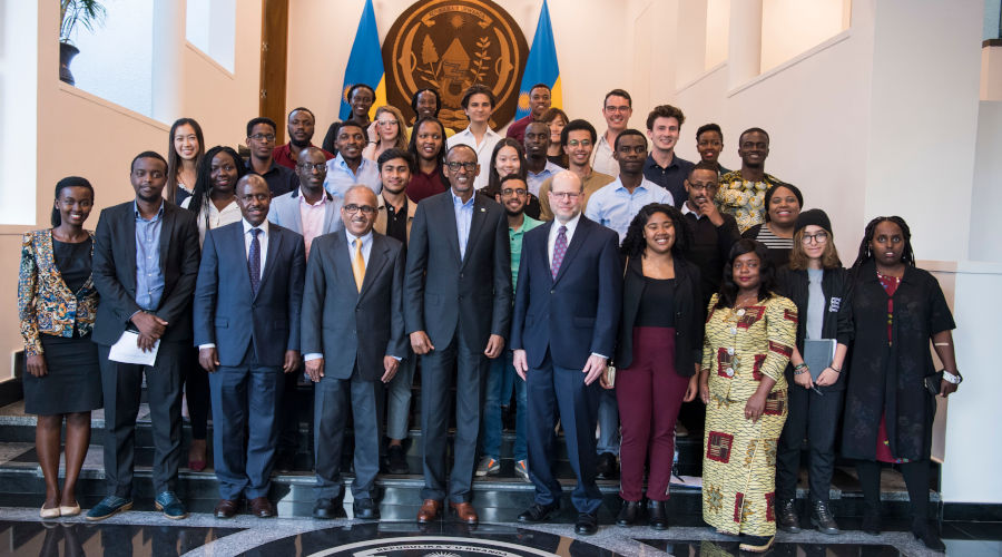 President Kagame poses with Carnegie Mellon University students, faculty members and Education Minister Eugene Mutimura in Kigali yesterday. The President and the students discussed the country’s vision of advancing science and technology, and the role they can play towards that cause. The students are in Rwanda under the CMU-Project Rwanda, a student-led community service initiative that connects CMU students to its Pittsburgh (USA), Qatar and Rwanda campuses with the aim of enhancing the educational experience of Rwandan youth through technology. / Village Urugwiro