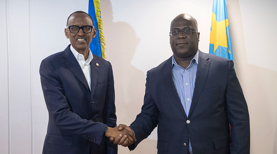 Presidents Paul Kagame and his DR Congo counterpart Fu00e9lix Tshisekedi during the latter's visit to Rwanda in March this year when he attended the Africa CEOs Forum. President Kagame will hold a tete-a-tete with his counterpart before paying tribute to deceased ex-PM Etienne Tshisekedi. / Village Urugwiro
