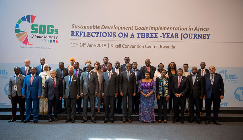 President Kagame in a group photo with other continental leaders during the conference on the implementation of the SDGs in Africa held in Kigali yesterday. The conference brought together about 2000 people to discuss the SDGs journey across Africa in the last three years. Village Urugwiro.