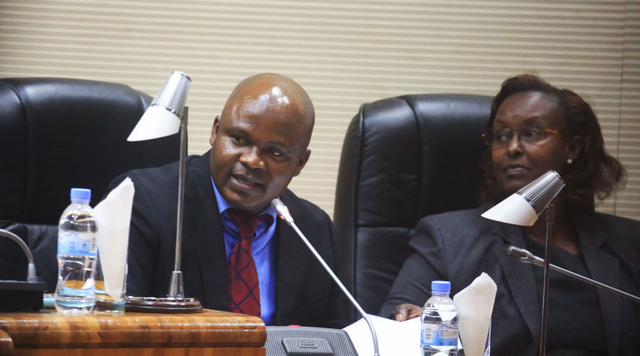The Chairperson of the parliamentary Standing Committee on Budget and Patrimony, Omar Munyaneza (left), speaks during a recent session as his deputy Francesca Tengera looks on. / Sam Ngendahimana