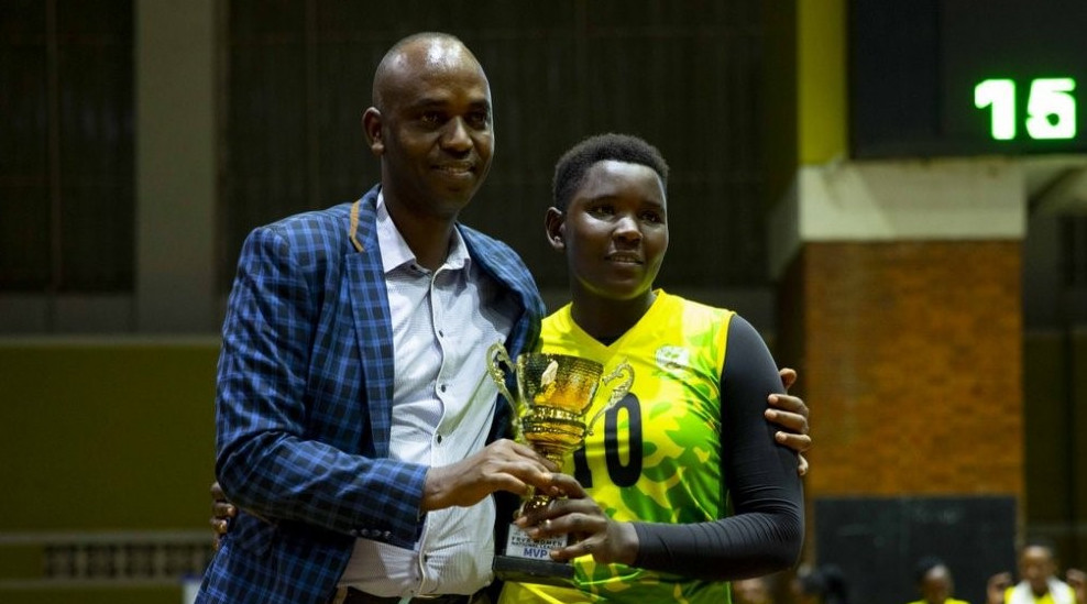 Benitha Mukandayisenga is seen here receiving her MVP award, for the 2018-19 league season, from former Rwanda Volleyball Federation’s president, Gustave Nkurunziza, at Amahoro Stadium last month. / Courtesy