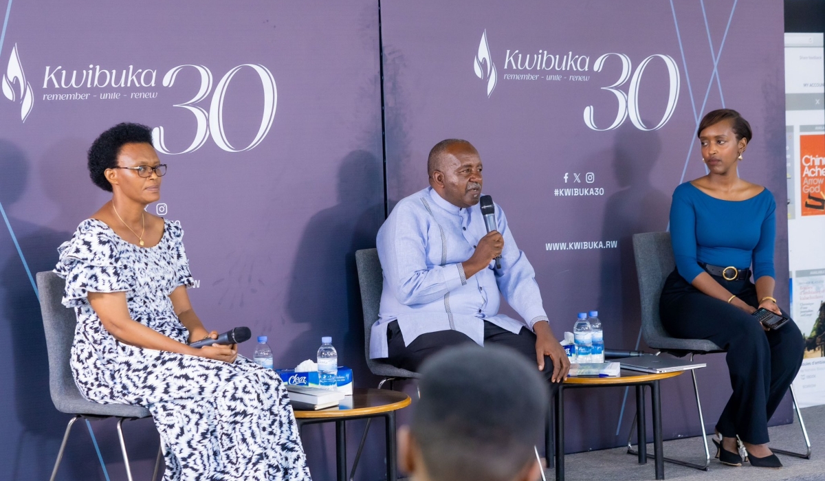 R-L Stéphanie Gasana (daughter of Oscar Gasana); Eric Nzabihimana, one of the survivors of Bisesero, and Marie Claire Gatayire, the moderator. Photo by Emmanuel Ntirenganya