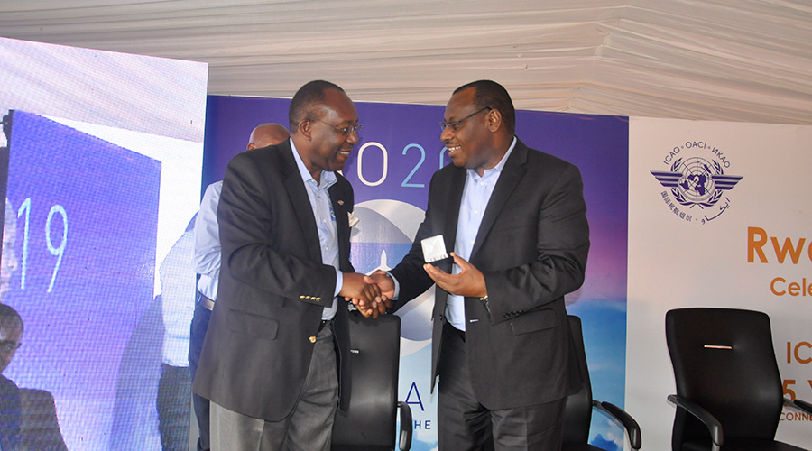 The Minister for Infrastructure Amb. Claver Gatete shakes hands with Barry Kishambo, the Director General of ICAO for Eastern and Southern Region, during the event to the celebrate the 75th anniversary of the Chicago Convention in Muhanga District, yesterday. / Craish Bahizi