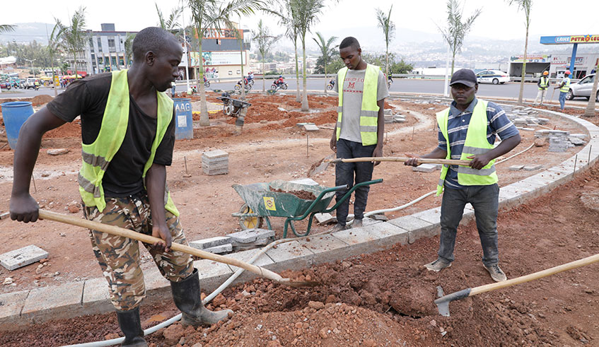 Workers at the Sonatubes roundabout in Kicukiro District on Tuesday. The City of Kigali will spend Rwf14 billion on upgrading city roads as it prepares to host at least 10,000 delegates during next year’s Commonwealth Heads of Government Meeting (CHOGM). Emmanuel Kwizera.