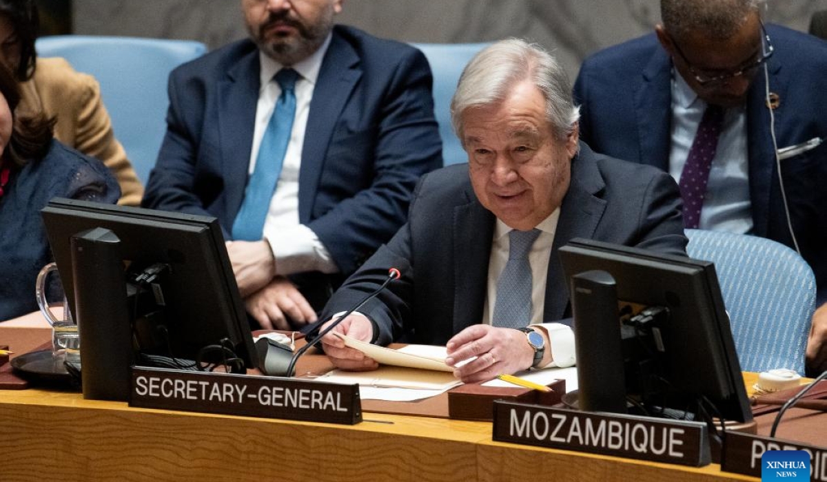 UN Secretary-General Antonio Guterres (Front) speaks at a Security Council meeting at the UN headquarters in New York, on May 23, 2024. Guterres said Thursday that there is a need to embed African participation and leadership across the global peace and security architecture. (Manuel Elias/UN Photo/Handout via Xinhua)