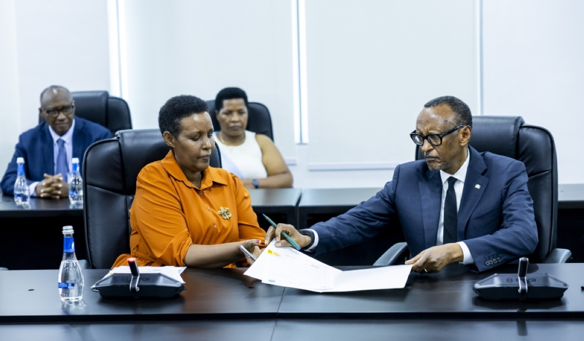 President Paul Kagame (R) presents his candidature to the Chairperson of the National Electoral Commission, Oda Gasinzigwa, on May 17, 2024, as he seeks re-election as the Head of State (courtesy)