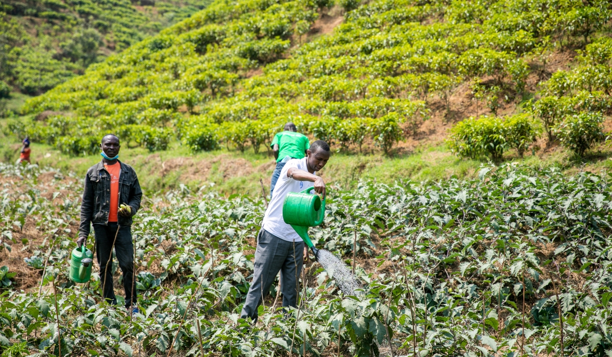 Men watering gardens to boost productivity. FAO officials say Social protection has a critical role to play in boosting productivity, improving food and nutrition security. All photos: Olivier Mugwiza.