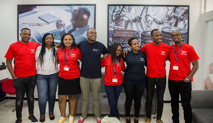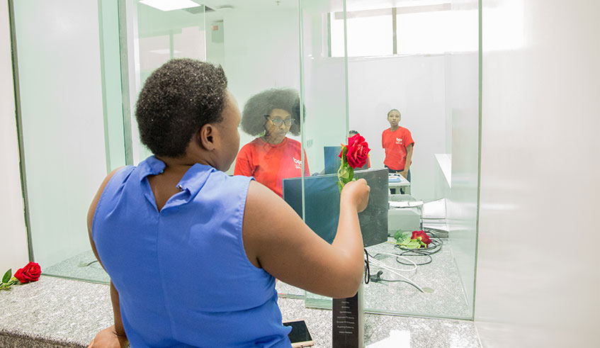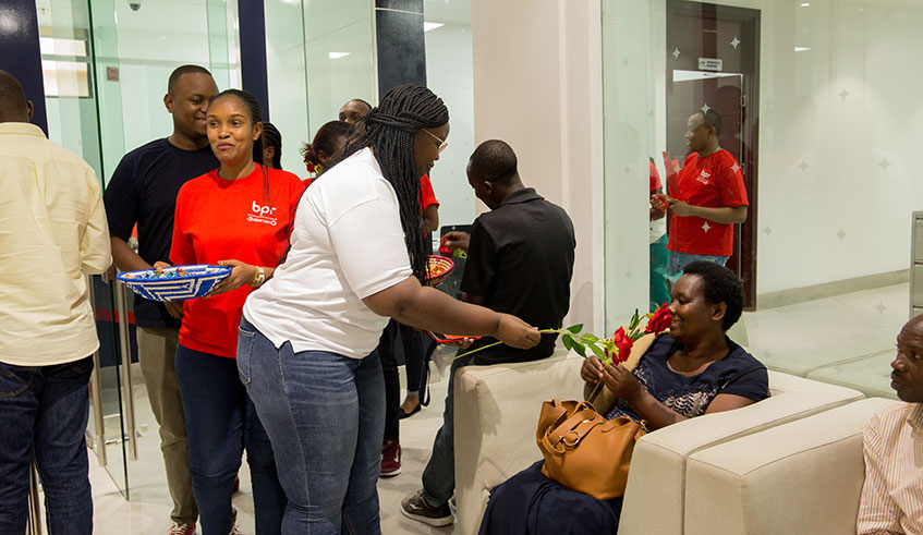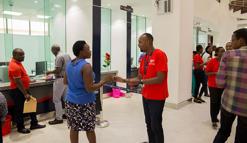 Prossie Kalisa head of Marketing and Communication at BPR gives Valentine's day gift to client at BPR Branch in Kacyiru, KBC on 14th February 2020. (Photos by Dan Nsengiyumva)