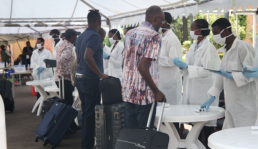 Health workers test government officials and executives from the private sector for coronavirus on Saturday ahead of their departure for the National retreat in Gabiro. Rwanda now has a Lab to test for the virus at Rwanda Biomedical Centre's National Referral Lab in Kigali / Photo: Craish Bahizi.