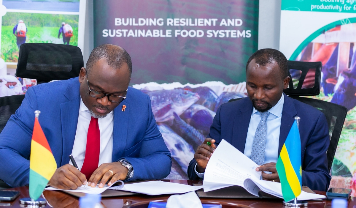 Rwanda’s Minister of Agriculture and Animal Resources, Ildephonse Musafiri (R), and his Guinean counterpart Felix Lamah sign the agriculture cooperation agreement on June 3, 2024, in Kigali. Courtesy.
