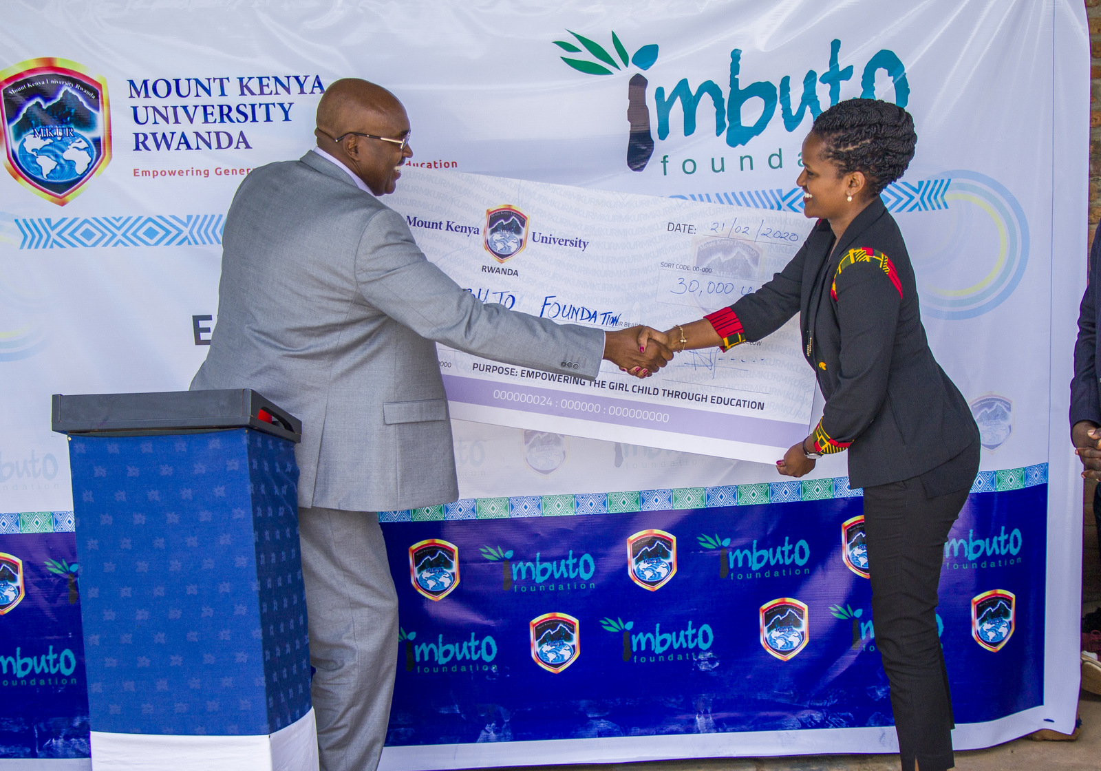 Chairman and Founder of Mount Kenya University, Prof Simon Gicharu (L) hands over a $30,000 cheque to the Director General of Imbuto Foundation, Sandrine Umutoni.