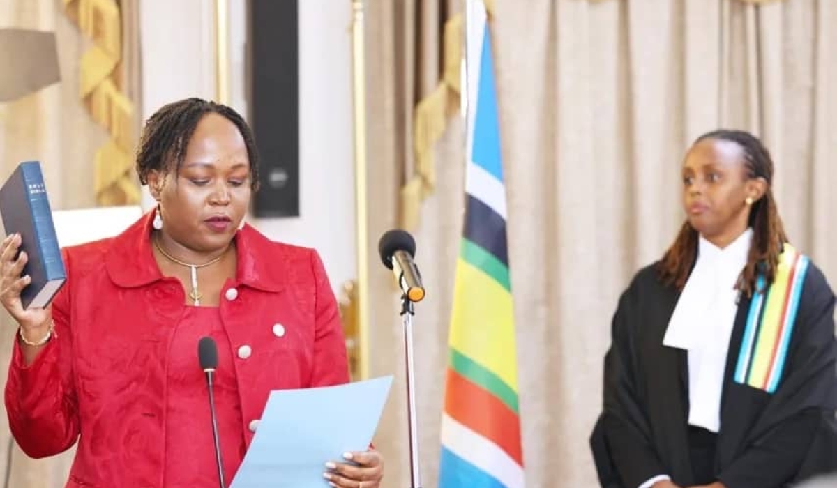 The new EAC Secretary General, Veronica Mueni Nduva (left), takes the oath of office at State House, Juba, South Sudan. Looking on is the Registrar of the East African Court of Justice, Christine Mutimura-Wekesa.