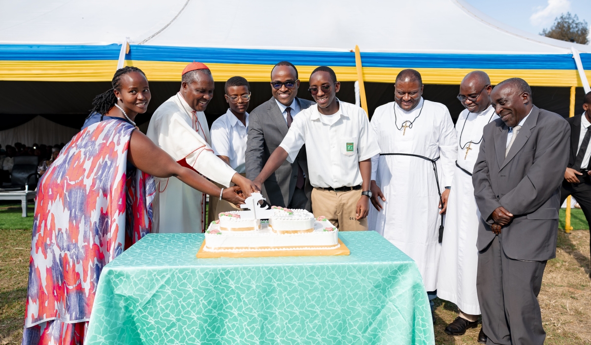 Cardinal Antoine Kambanda and Minister of Education Gaspard Twagirayezu join students to cut a cake during Lycee de Kigali's celebration of golden jubilee on Saturday, June 8. Photos by Christianne Murengerantwari
