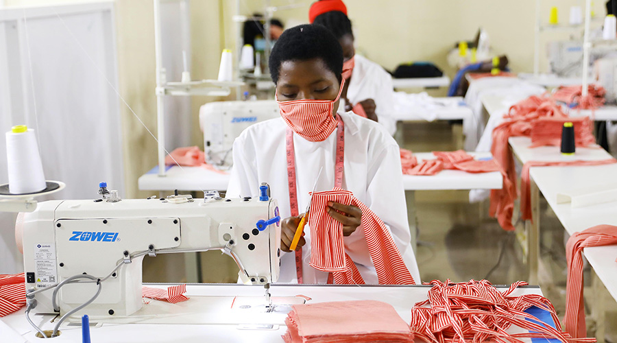 Workers at Apparel Manufacturing Group Ltd make facemasks in Kigali last month.