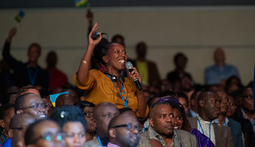 A participant makes an intervention during a Rwanda Day event held in Bonn, Germany in October 2019. The annual event has played a significant role in linking members of the Rwandan Community Abroad with the developments back home. / Village Urugwiro