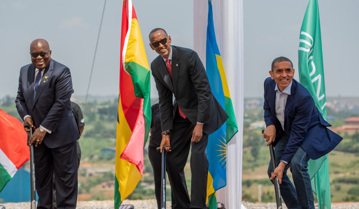 President Paul Kagame (center) breaks ground for BioNTech manufacturing plant in Kigali with Ghana's President Nana Akufo-Addo (left) and BioNTech CEO Ugur Sahin in June 2022. It is Africa's first mRNA technology vaccines plant.