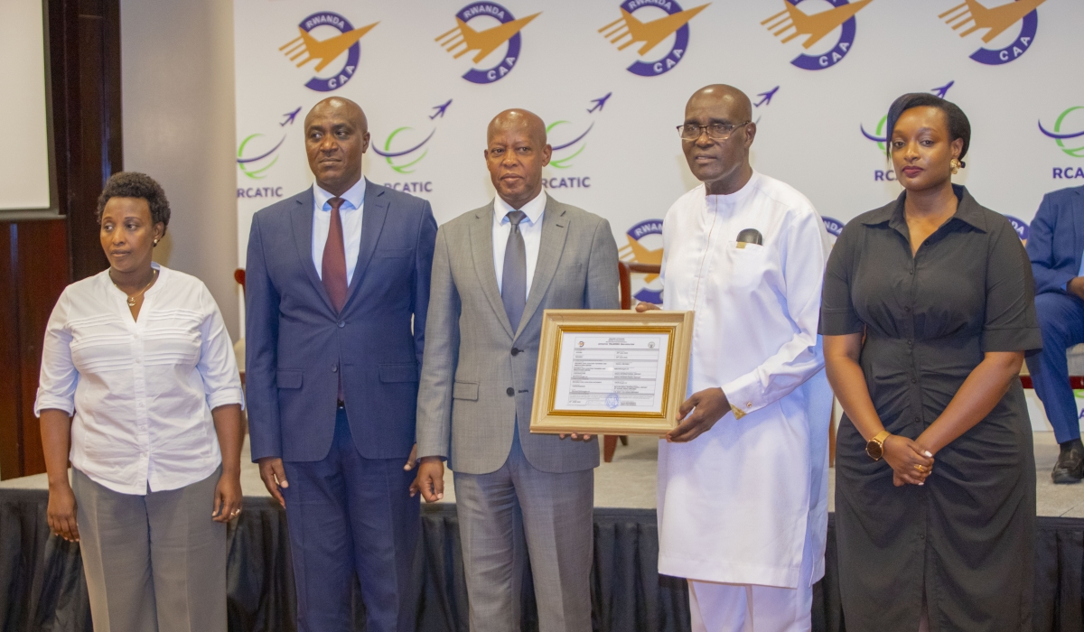 Rwanda Civil Aviation Training and Innovation Centre officials pose for a group photo after receiving the certificate during the official launch in Kigali on June 20. Photo Courtesy