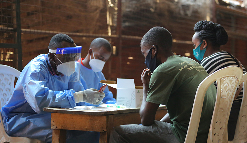 A health worker tests a randomly selected person at Nyabugogo market last week. The home-based care system, which was rolled out countrywide on Friday, August 28, will ensure majority of Covid-19 cases are isolated in their homes. / Photo: File.