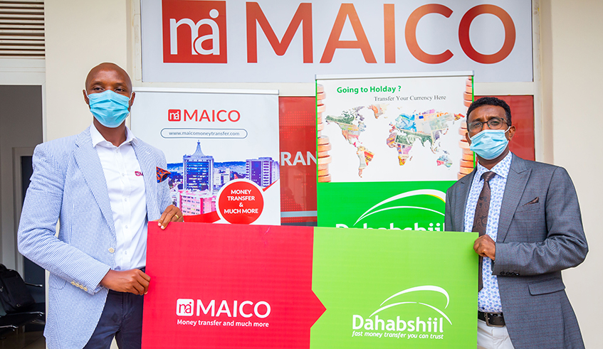 Maico Money Transfer Chief Executive Innocent Higiro (left) and Mustafe Sheikh Adan Amin, the Managing Director of Dahabshiil in Rwanda, hold a signage during the launch of partnership be- tween the two companies in Kigali on Tuesday, September 29. / Photo: Courtesy.