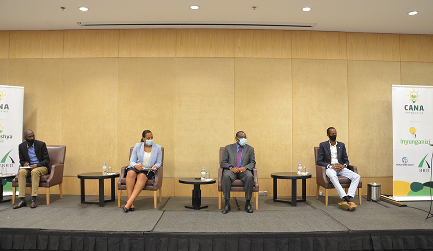(L-R) Evariste Ntiriza, the manager of Inshuti z'Imugano SACCO (one of the clients) BRD CEO Kampeta, Minister Gatete and Justus Mucyo, the Managing Director of Bboxx a local solar energy distribution firm during a panel discussion at the launch on Friday October 2. / Craish Bahizi