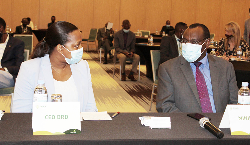BRD CEO, Pitchette Kampeta Sayinzoga and infrastructure minister Clever Gatete speak during the launch of Subsidy Window and Guarantee Framework on Friday. / Craish Bahizi