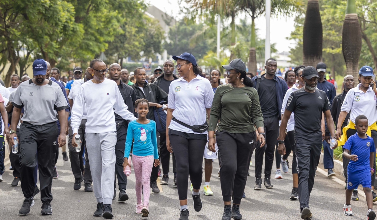 President Paul Kagame and First Lady Jeannette Kagame, on Sunday, October 17, joined residents of Kigali City for the car-free day mass sports activity. The popular sporting activity that takes place at least twice a month was also attended by Uganda's General Muhoozi Kainerugaba who is on a private visit to Rwanda since Saturday. Citizens from all walks of life were seen engaging in activities like jogging, cycling, skating and walking. The exercise coincided with this year's Breast Cancer Awareness Walk, as part of the activities to mark the Breast Cancer Awareness month.