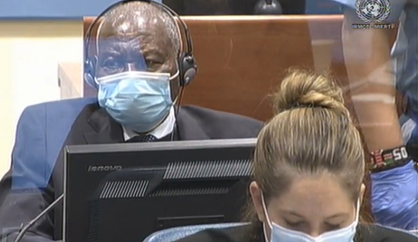 Genocide suspect Fu00e9licien Kabuga (behind) in the dock at theu00a0International Residual Mechanism for Criminal Tribunals in the hague, Nethlerlands on Wednesday, November 11, at the start of hearing in which he faces seven accounts of genocide related crimes. / Photo: Courtesy.