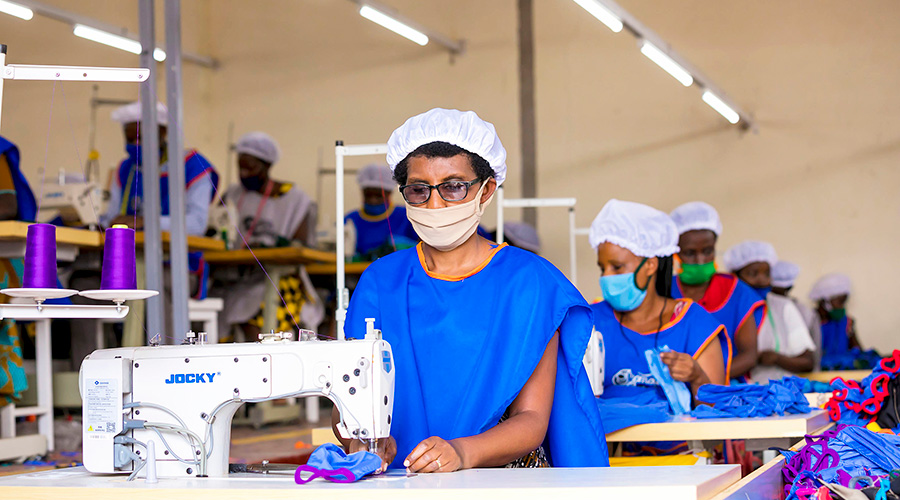 Workers make face masks inside Weya Creations garment factory in Kigali. Despite the high demand for face masks to control the spread of the virus, garment factories are among businesses that were hit hard by Covid-19.