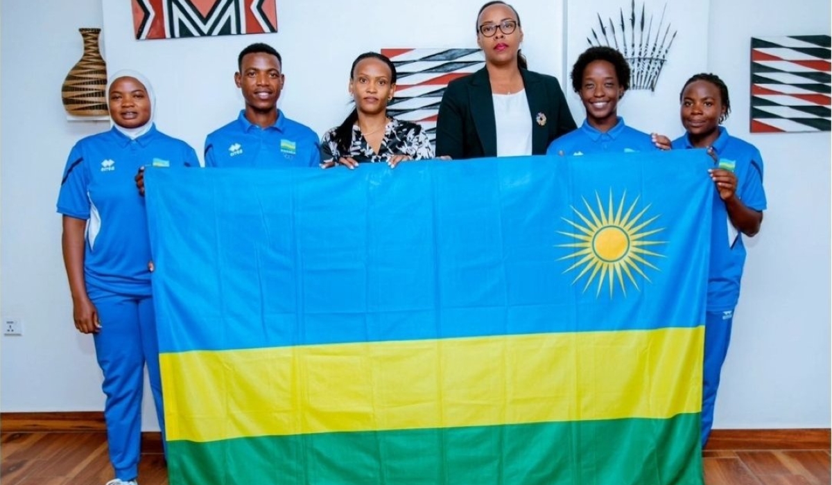 Rwandan cyclist Eric Manizabayo (2nd L) with other athlets who will represent Rwanda at the 2024 Olympic Games scheduled for July 26 to August 11 in Paris, France, receive a national flag before heading to France.