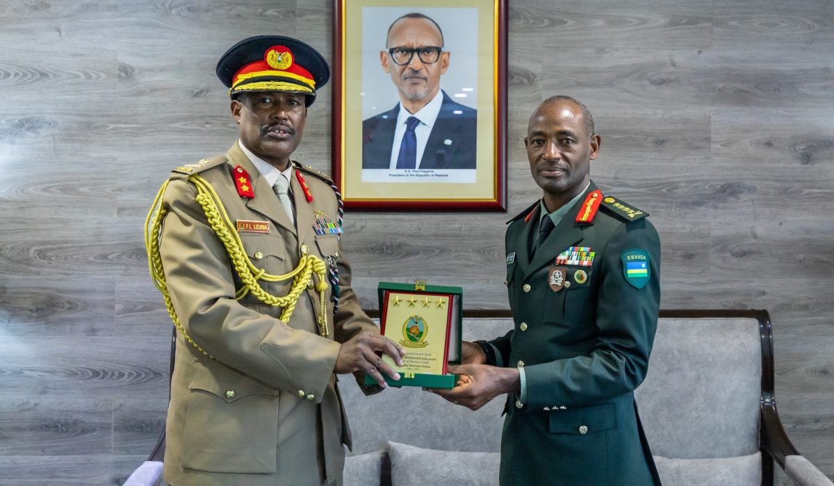 Rwanda Defence Force Chief of Defence Staff Gen Mubarakh Muganga presents a gift to Maj Gen Frederick Leuria, the Assistant Chief of Defence Force for operations, planning, doctrine and training of the Kenyan Defence Forces (KDF), in Kigali, on Friday, July 5.
