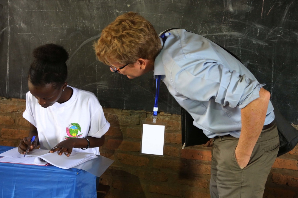 One of the European Union observers checks out what a National Electoral Commission volunteer is doing at the Kimironko II polling site, in Kigali, during the parliamentary elections on September 3, 2018. Photo by Sam Ngendahimana