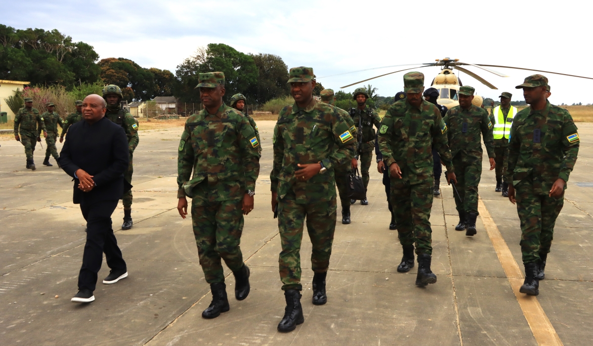 Left to right: Maj Gen Alberto Diago Nampele, the Army Commander of Mozambican forces, Rwanda Defence Force Army Chief of Staff Maj Gen Vincent Nyakarundi, the Joint Task Force Commander, Maj Gen Alex Kagame, and other senior officers, arrive at Mocimboa da Praia airport on July 11. Courtesy