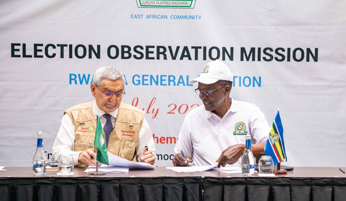 Jorge Carlos Fonseca (L), the former President of Cabo Verde who led the joint African Union-Common Market for Eastern and Southern Africa election observers' delegation interacts with David Maraga, the former Chief Justice of Kenya who headed the EAC Election Observation Mission during a press conference on Wednesday, July 17. Dan Gatsinzi