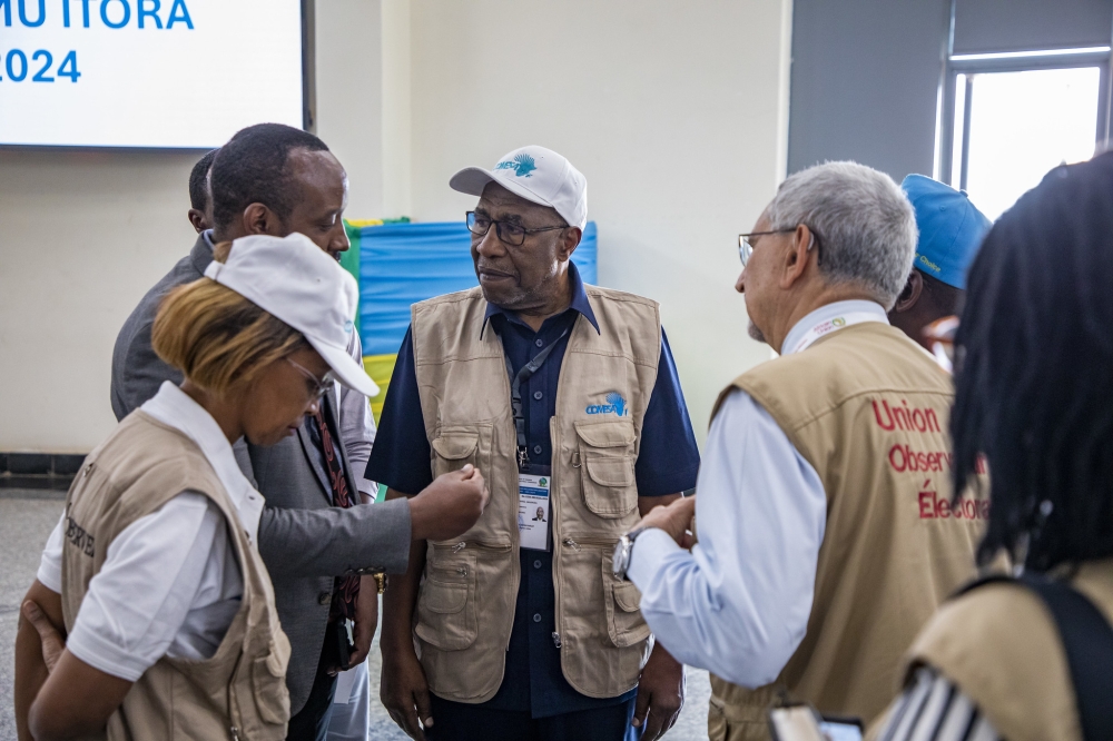 Jorge Carlos Fonseca (R), the former President of Cabo Verde who led the joint African Union-Common Market for Eastern and Southern Africa election observers' delegation, his deputy head of mission, Ruhakana Rugunda (C), Uganda's former Prime Minister, and other observers, in Kigali on Tuesday, July 16. International election observers commended Rwanda for a peaceful electoral environment during the July 15-16 general elections. Photo by Emmanuel Dushimimana