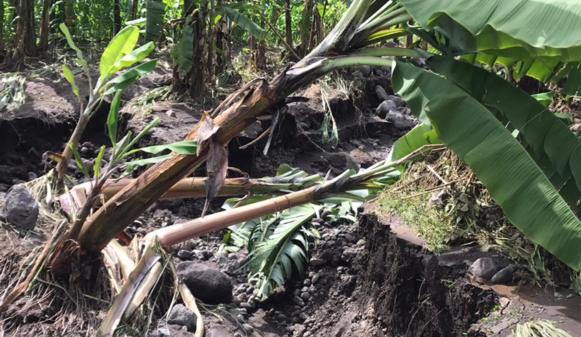 One person has died in Gahunga Sector of Burera District due to floods that were caused by heavy rain on Thursday, which also damaged infrastructure and people’s properties, including over 230 hectares of crop plantations. According to district officials, floods from volcanoes have destroyed one major bridge on the road linking Burera and Musanze districts and damaged plantations of potatoes, maize, beans, pyrethrum. Other damages include eight residential houses. The district has yet to estimate the monetary value of the damages. “We are now working with people and other stakeholders, such as the Ministry of Emergency Management and Rwanda Water Resources Board, to find ways the damages can be compensated as well as fix the bridge which has collapsed,” Marie Chantal Uwanyirigira, Mayor of Burera District, told The New Times on Friday. Burera is located in a region prone to seasonal floods due to uncontrollable streams of water from the volcanoes. During rainy seasons, the streams flood gullies (locally known as imyuzi), leading to loss of lives and damaging infrastructure and people’s properties. Burera District has 11 such gullies. Uwanyirigira said Gahunga Sector has one of the most dangerous gullies. Solution to floods from volcanoes Since December 2019, a flood management project has been building retaining walls and water ponds along the gullies. By 2024, the Rwf35 billion project is expected to solve the problem of seasonal flooding in four districts in the volcanoes region (Burera, Musanze, Nyabihu and Rubavu), according to Rwanda Water Resources Board, one the implementers. “The project started in Burera and Musanze which have the most critical gullies. Currently, the implementation of is about 40 percent,” said Davis Bugingo, Division Manager in charge of flood management at Rwanda Water Resources Board. In Rwanda, the maximum rainfall in a year occurs during the main rainy season, which starts from March to May. Recently, Rwanda Meteorology Agency forecasted an above normal rainfall in May. Burera, Musanze, Nyabihu and Rubavu are among districts which will have the highest amount of rainfall.