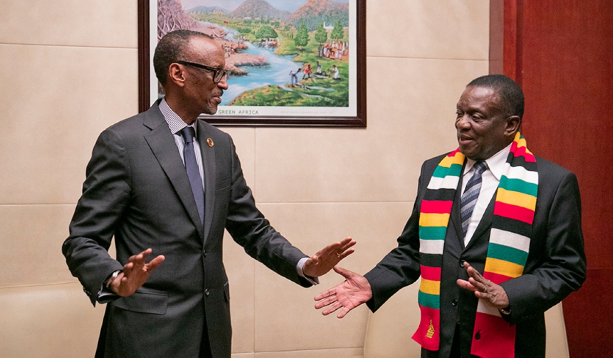 President Kagame interacts with Zimbabwe President Emmerson Mnangagwa during a meeting in Ethiopia on February 10, 2019. Mnangagwa sent his congratulations to President-elect Paul Kagame.