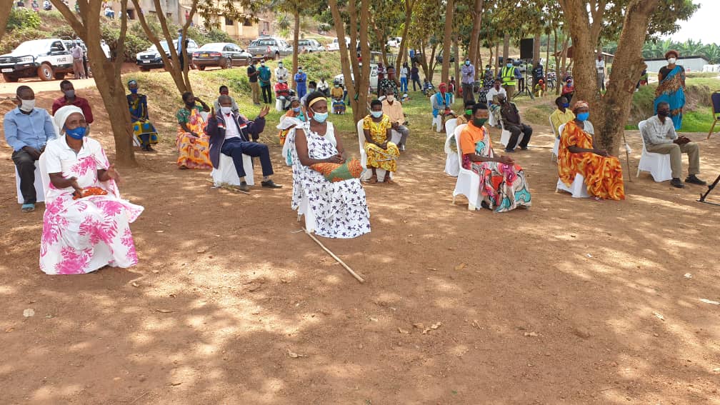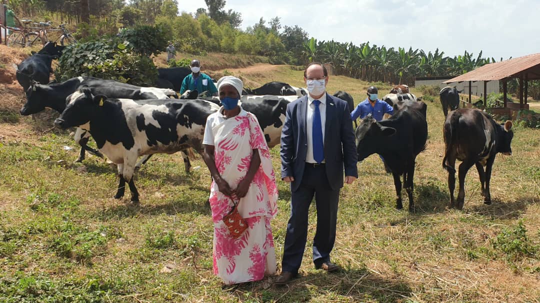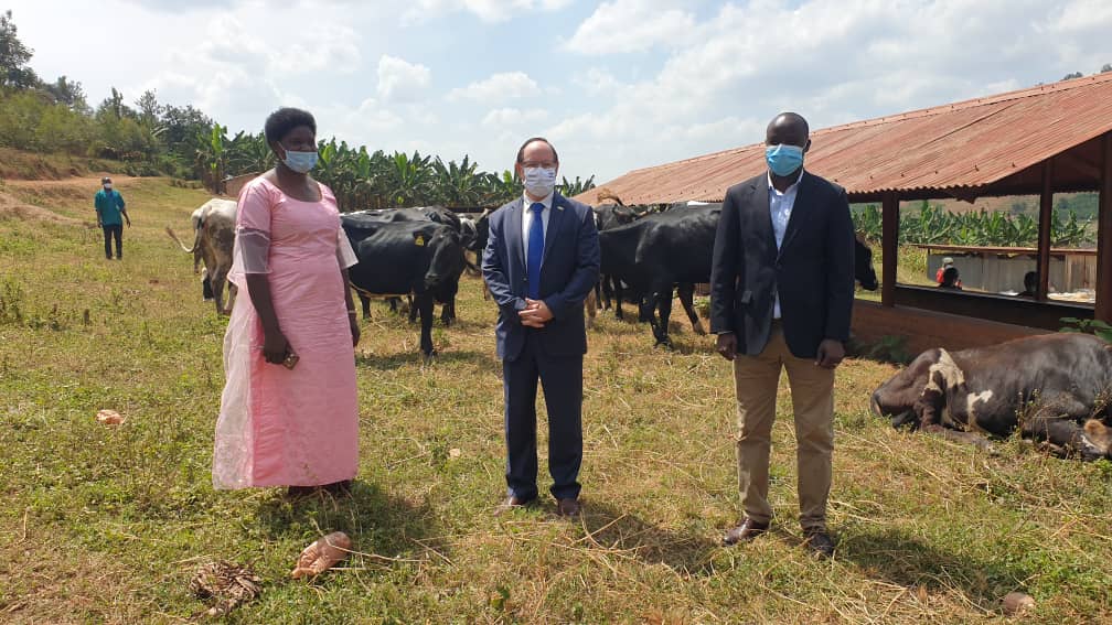 Israeli envoy Ron Adam (centre), Gisagara District mayor Jerome Rutaburingoga (left) and one of the beneficiaries at the handover ceremony on Thursday. / Courtesy