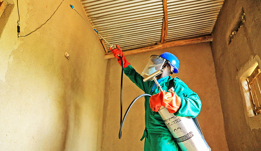 A health worker carries out indoor residual spraying in Bugesera District recently. Rwanda Biomedical Centre has received $53 million from Global Fund to support the fight against malaria. The money will mainly go to indoor residual spraying in six districts for the next three years. / Photo: Dan Nsengiyumva.