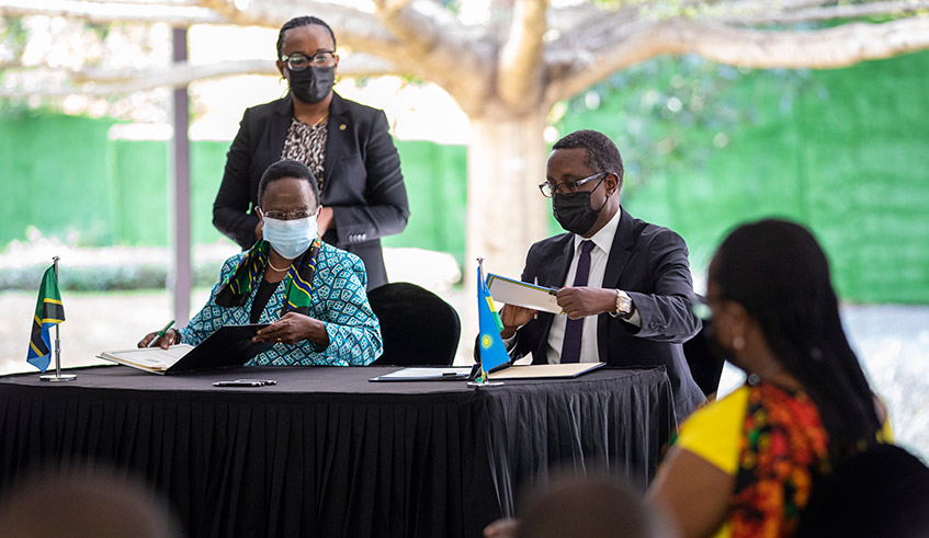 Rwanda and Tanzania on August 2, signed four bilateral agreements during a two-day state visit by Tanzanian President Samia Suluhu Hassan on the invitation of her counterpart President Paul Kagame. On the first day of the visit, the two leaders held one-on-one talks followed by bilateral talks which culminated in the signing of four bilateral agreements, a function that was overseen by the two heads of state. The agreements include a Memorandum of Understanding on cooperation in the field of information and communication technology. The agreement was signed by Tanzania’s Minister of Communication and Information Technology, Faustine Ndugulile and his Rwandan Counterpart Paula Ingabire. Some of Rwanda’s submarine sea cables IT infrastructure are through the coast of Dar es Salaam. The two countries also signed an agreement on cooperation in areas of immigration and another on cooperation in the areas of education matters. The fourth agreement was cooperation in areas of regulation of medical products. The three agreements were signed by Tanzania’s Minister for Foreign Affairs and East African Cooperation Liberata Mulamula and Dr. Vincent Biruta, Rwanda’s Foreign Minister. The two heads of state termed the agreements as an opportunity to make the most of warm ties enjoyed by the two countries. Speaking after the agreement signing, President Kagame said that beyond sharing a border, the two nations have strong historical ties and common aspiration to deliver prosperity to their citizens. On her part, President Suluhu said that going forward, they seek to build on the historic ties to go beyond current areas of cooperation. Currently, the ties are strongest in trade and investment with potential in multiple other avenues with Rwanda exporting to Tanzania goods valued at close to $300 million annually. On its part, Tanzania send goods worth over $500m to Rwanda annually.