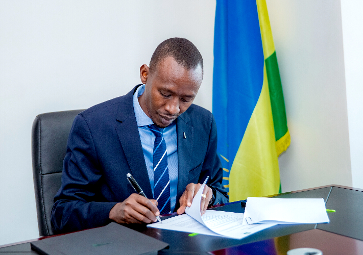 Nick Barigye, the Chief Executive of Rwanda Finance Limited, signs an MoU with the Monetary Authority of Singapore in Kigali on August 26. / Photo: Olivier Mugwiza.