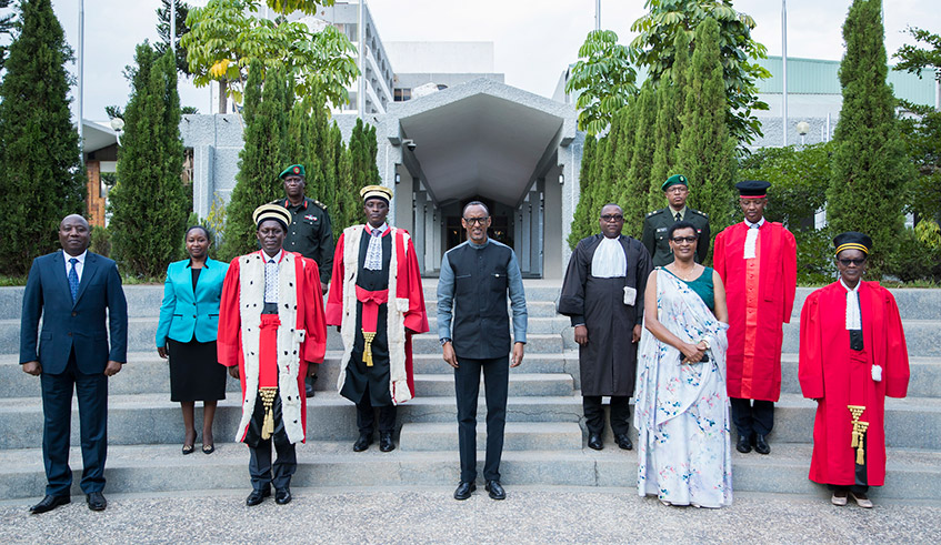 President Paul Kagame, flanked by Donatille Mukabalisa, the Speaker of the Chamber of Deputies (right) and Chief Justice Faustin Ntezilyayo, pose with some members of the legal fraternity at the Parliamentary Buildings in Kimihurura on Monday, September 6, shortly after the ceremony to launch the 2021/22 Judicial Year. / Photo: Village Urugwiro.