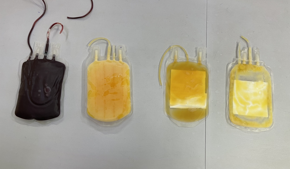 Various blood components in dedicated bags from left to right: red blood cells, plasma, platelets, and cryoprecipitates, at RBC’s Blood Transfusion Division in Kigali, on July 30, 2024. Rwanda plans to sell plasma surplus to address production cost and ease access to derived lifesaving medication.