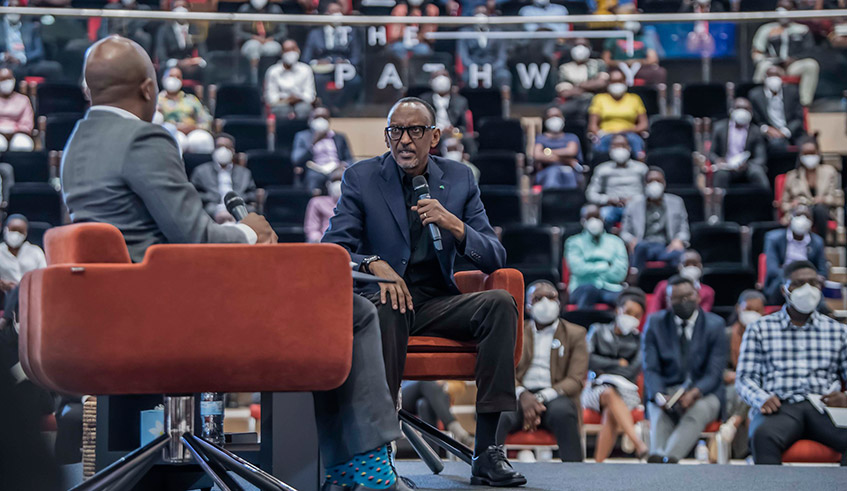 President Paul Kagame engages university students on Monday, September 20, at the Kigali Convention Centre during The Pathway series hosted by Fred Swaniker, founder of the African Leadership Group. The President urged young people not to shy away from tasks and responsibilities that seem hard, noting that the cost of leaving them undone could have long term consequences. / Photo: Village Urugwiro.