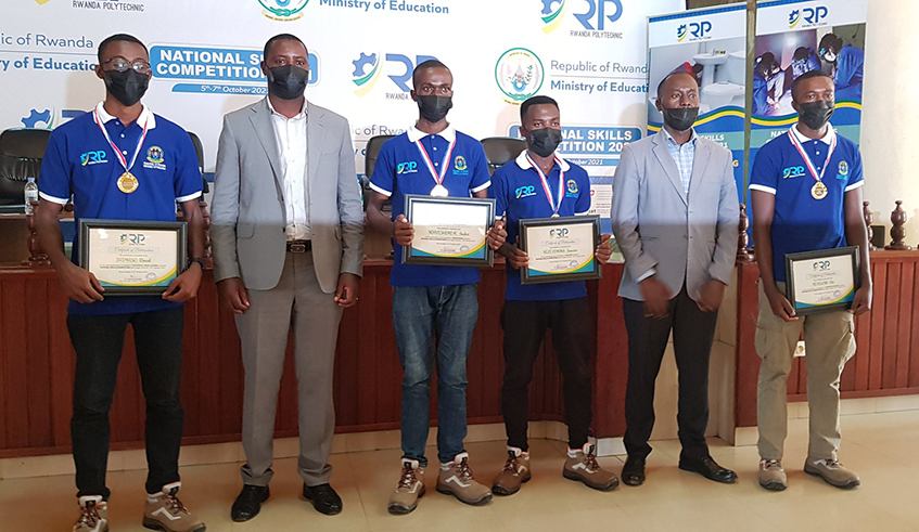 Golden awards: The four best winners (L-R) David Irimaso, Andru00e9 Ndayishimiye, Janvier Nizeyimana, and Elie Niyigena pose with officials at the closing of the National Skills Competition 2021 in Kigali on Thursday, October 7. They will represent Rwanda during the WorldSkills Africa 2022 competition in Swakopmund, Namibia next year. / Photo: Courtesy.