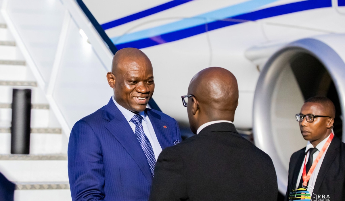 President of Gabon, Brice Oligui Nguema interacts with Minister of Foreign Affairs Olivier Nduhungirehe on his arrival at Kigali International Airport on Saturday, August 10. Photo by Steven Mugenzi