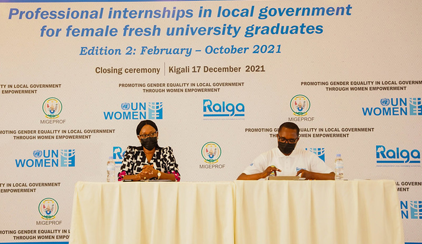 A total of 100 female leaders who have graduated from an internship programme organised by the government are set to increase gender equality in the local government seats, activists have said. The internship which was organised by Rwanda Local Government Authorities (RALGA), UN Women and the Ministry of Gender and Family Promotion has been concluded in a graduation event that took place on Friday. Dubbed, “Professional internship in local government for female fresh university graduates,” the programme took place from February to October 2021. Running for its second edition, it targeted female fresh university graduates who have demonstrated outstanding performance in their college studies. Ladislas Ngendahimana, the Secretary General of RALGA explained the idea behind the initiative. “Having our leadership dominated by women is a commendable move, but the development is not natural, it is strived for, nurtured and fought for. That’s why we are training these young leaders to prepare for the future cohorts of our leaders,” he noted. Ngendahimana asserted that this program which started in 2019 has a strong ambition to empower women and girls to work in local authorities. Some of the interns contented for local government positions in the recently concluded elections, and 20 of them were successful. Solange Umutesi, the Executive Administrator of Kicukiro District testified to a greater role of the fellowship that nurtures young leaders, and addresses unemployment issues. “Fellowships like these enlighten young women and show them the potential and the opportunity they have at the workplace. I am sure that these 20 fellows who were recently elected had not identified their capabilities before commencing the internships,” Umutesi observed. Dr. Jeanette Bayisenge, the Minister of Family and Gender Promotion applauded the graduating interns, for having undertaken the training during tough times. “We appreciate your zeal, passion and motivation to go with this internship, during the challenging times of the pandemic”, she said. She then highlighted why her institution chose to focusing on the local government: “We prefer the local government, because it is the pathway of the government services to the people, and we have to do this because even if we have 33 percent of local positions occupied by women, that is the minimum target, not the maximum,” she noted. One of the beneficiaries, Valentine Mukashya, a graduate of Applied Statistics from the University of Rwanda says that the internship has been beneficial to her career. “Most of the time, we study things in theory, but this internship has been an opportunity for me to go to the field, collect data and apply what I have learnt in real life,” she told The New Times. The recent local government elections have seen women occupying 46 percent of the local seats.