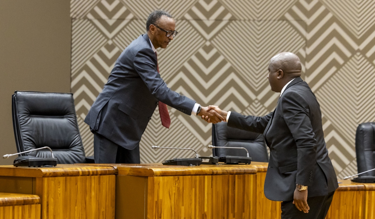 President Paul Kagame welcomes Prime Minister Edouard Ngirente after taking oath of office. PM Ngirente who was reappointed by President Paul Kagame, took oath on Wednesday, August 14, coinciding with the swearing-in of new members of parliament. Photo by Olivier Mugwiza