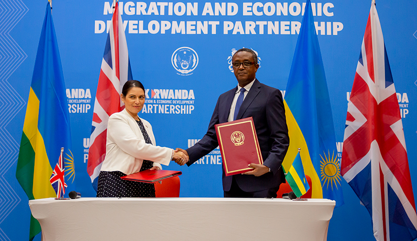 Rwanda’s Minister for Foreign Affairs and International Cooperation Dr Vincent Biruta and the United Kingdom’s Home Secretary Priti Patel exchange documents after signing the five-year deal on relocation of migrants and asylum seekers in Kigali on April 14. / Photo by Olivier Mugwiza.