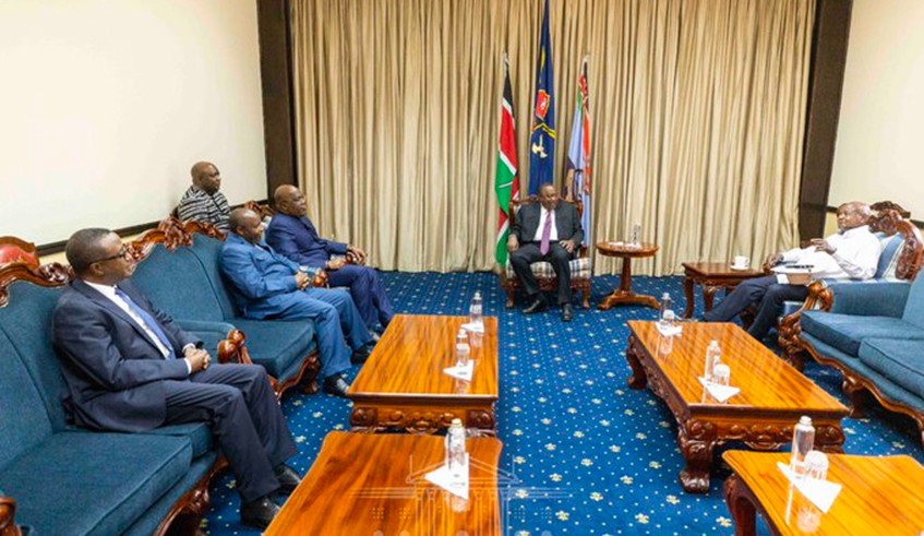Presidents Uhuru Kenyatta (Kenya), Yoweri Museveni (Uganda) , Evariste Ndayishimiye (Burundi) and Fu00e9lix Tshisekedi (DR Congo) and Rwanda's Minister for Foreign affairs and cooperation Vincent Biruta during a regional meeting of head of states in Nairobi on April 21. They discussed how to accelerate the establishment and urgent deployment of regional forces to help fight the negative forces in the Eastern DR Congo. / Courtesy