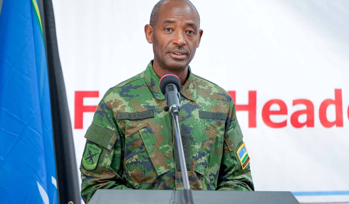 The RDF Chief of Defence Staff (CDS), General MK Mubarakh delivers remarks as he launched the Force Headquarters Staff Officers Training of Trainers Course at the Rwanda Peace Academy (RPA) in Musanze District.